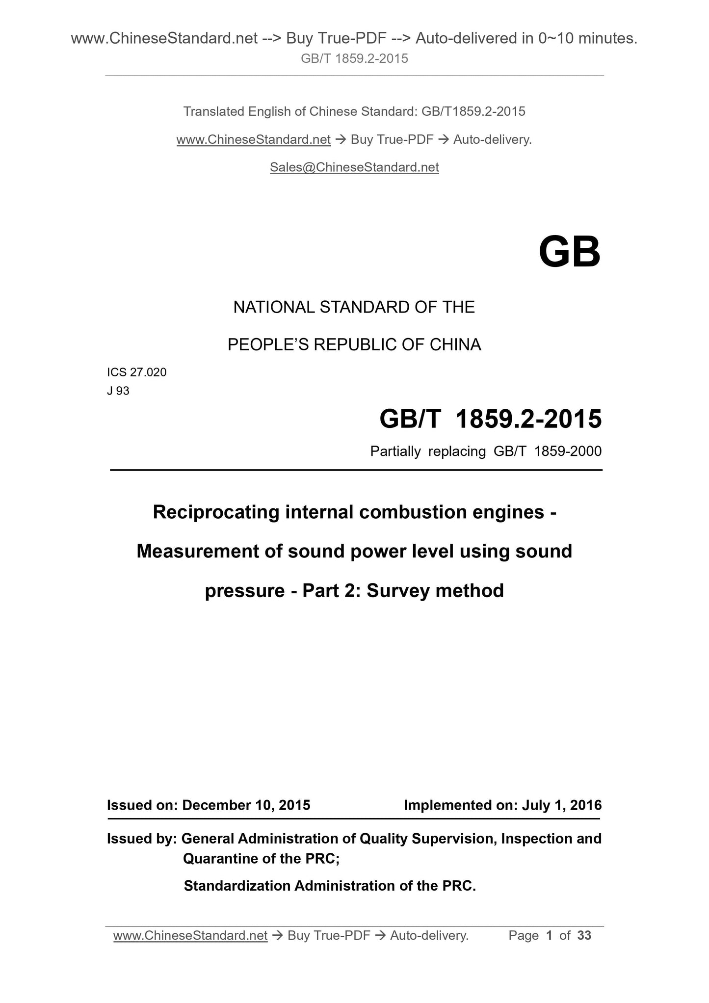 GB/T 1859.2-2015: Reciprocating internal combustion engines - Measurement of sound power level using sound pressure - Part 2: Survey method