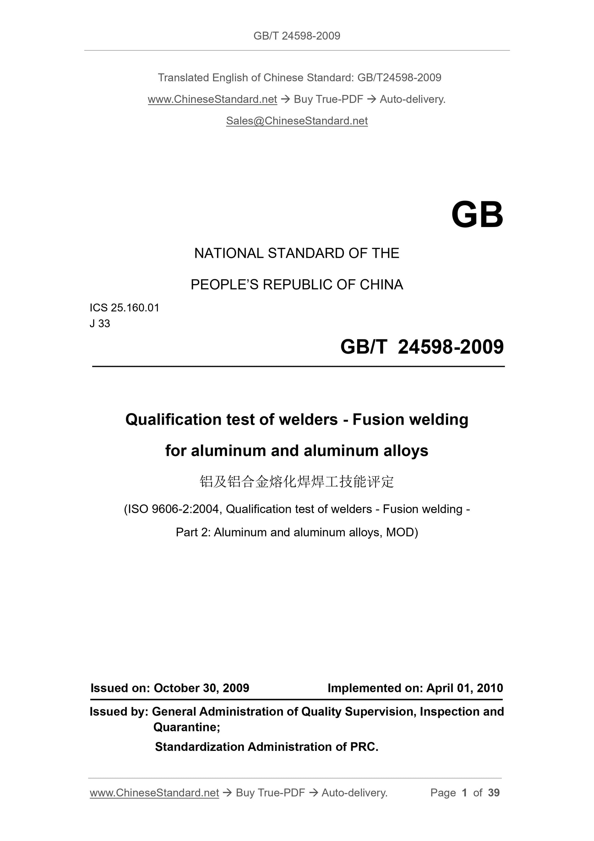 GB/T 24598-2009: Qualification test of welders -- Fusion welding for aluminium and aluminium alloys