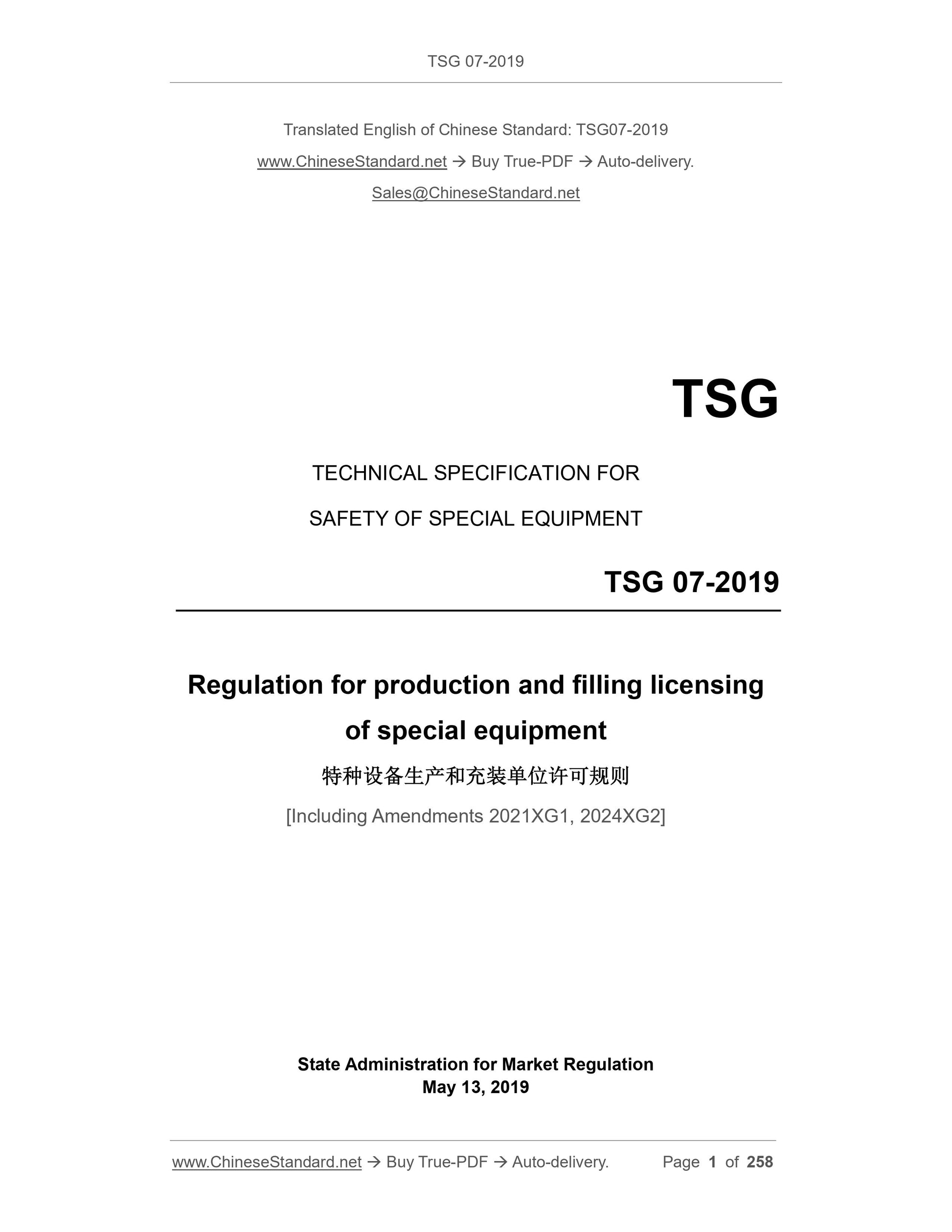 TSG 07-2019: [Including Amendments 2021XG, 2024XG2] Regulation for Production and Filling Licensing of Special Equipment