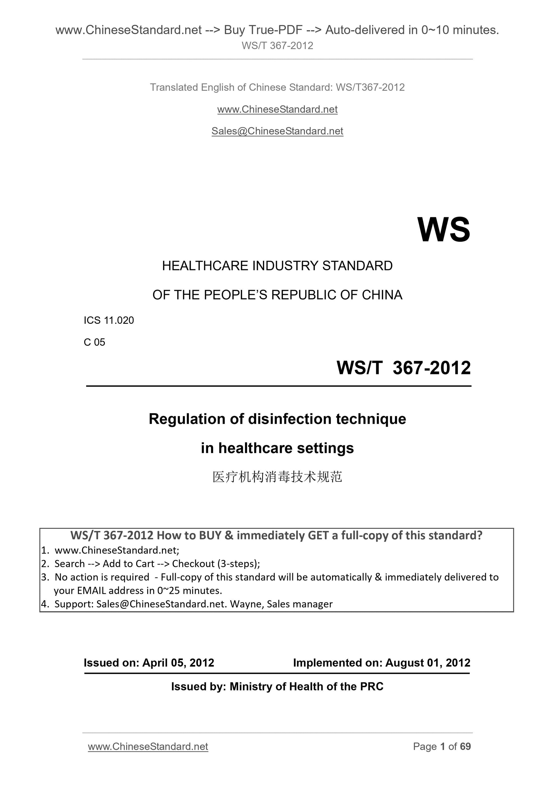 WS/T 367-2012: Regulation of disinfection technique in healthcare settings